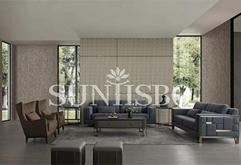 疏朗大气的客厅空间,整体采用低明度的木纹色,在保留实木质感同时,也为空间增添了一缕木香。沙发线条利落干净,深邃而浪漫的配色仿佛将居者带进了海洋世界。艺术编制皮料搭配金属底座,时尚大气质感扑面而来,将理性和感性完美结合,提高了居家的时尚格调。