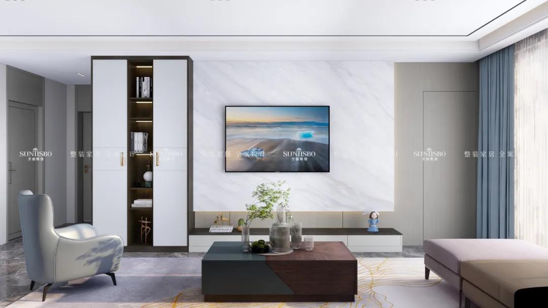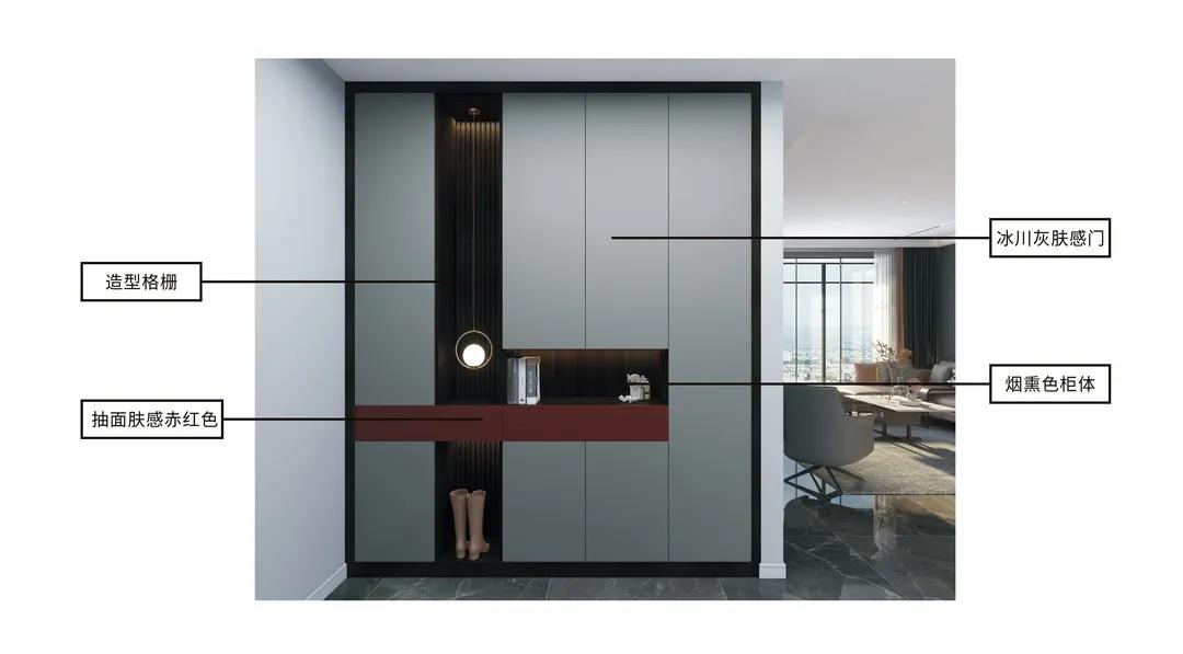 整体配色简约时尚,花色可选性多;材质上采用新型高级材料——欧松板,通过UV漆工艺表面形成超级肤感膜,使接触面舒适细腻。同时使用线条感简洁利落的拉手作为设计元素,子母拉手的设计别具一格,体现了设计师的用心;搭配灯光和功能件,使产品极具展示效果与功能性。