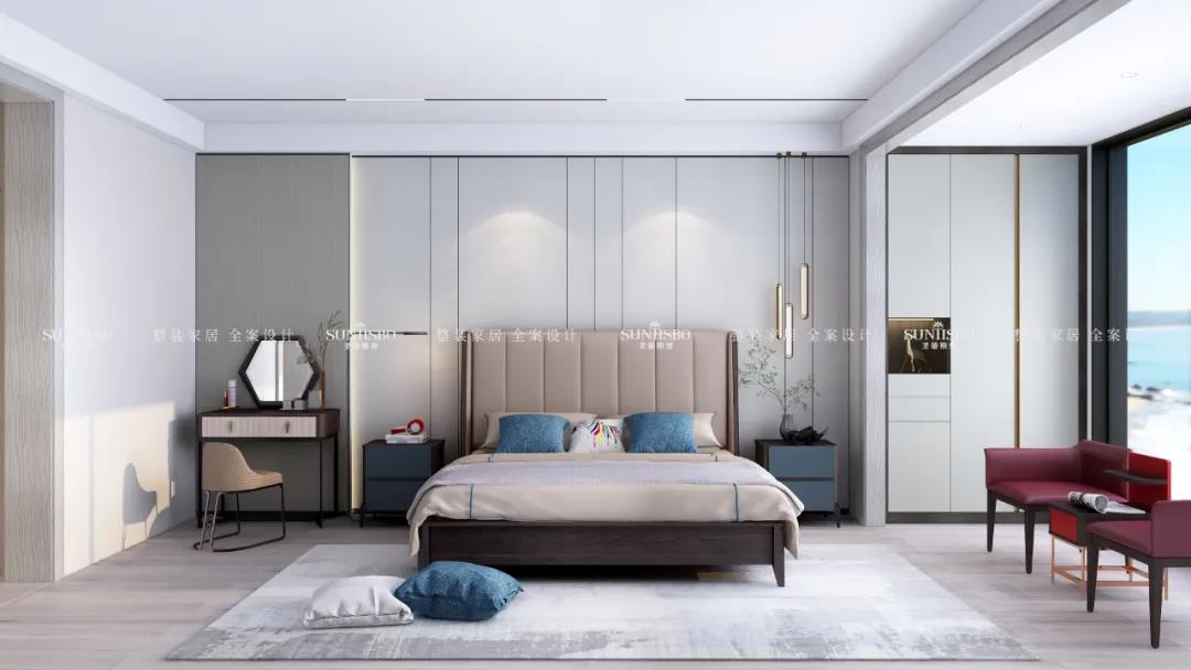 里奥系列新品是现代简约风格的创新演绎,其产品的设计理念是把轻奢风格的一些金属元素融入到现代简约风格中,使用大量的哑光亲肤材质代替亮光面,使理性的直线条和感性的色调调和搭配,整体打造一个简约而又舒适的空间。